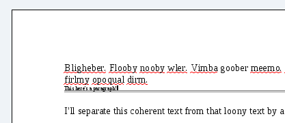 So stepping back one step, I was looking for another way to put in a horizontal line. I came across a shortcut on http://www.ooowiki.de/HelpOnRules, which I think is actually meant to be instructions for editing the wiki it’s on, but I didn’t realize it at the time and tried it out on Writer. Some of it works! Three hyphens, three equals signs, or three underscores in a row followed by a carriage return give instant lines of different styles. Incidentally, three plus signs give you a one-row, two-column table.