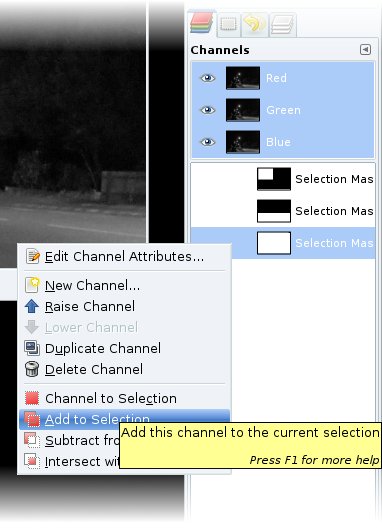 Then go to the Channels dialog and for each channel in turn, right-click and choose “Add to selection.”